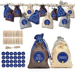 Orlegol Calendrier de l'Avent, 24 Sachets en Tissu à Remplir, Sacs Cadeau avec Etiquettes Numéro et 24 Pinces en Bois, Calendrier de Noel, Pochette Noël, Sachets en Jute pour DIY Décoration de Noël